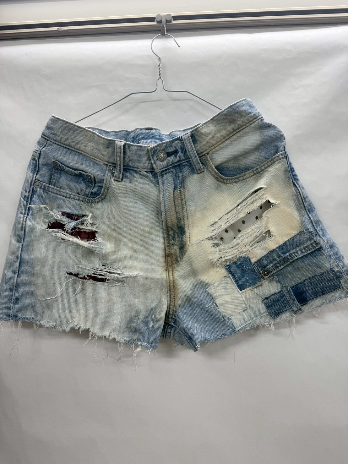こだわりのデザインが施された【Vyneraw】デニムショートパンツは、ダメージ加工が施され、個性的な魅力を引き立てています。水玉とチェック柄が絶妙に組み合わさり、カジュアルながらもオシャレ感を演出する一枚です。さらに、後ろには「vyneraw」の刺繍が施されており、さりげないアクセントとなっています。