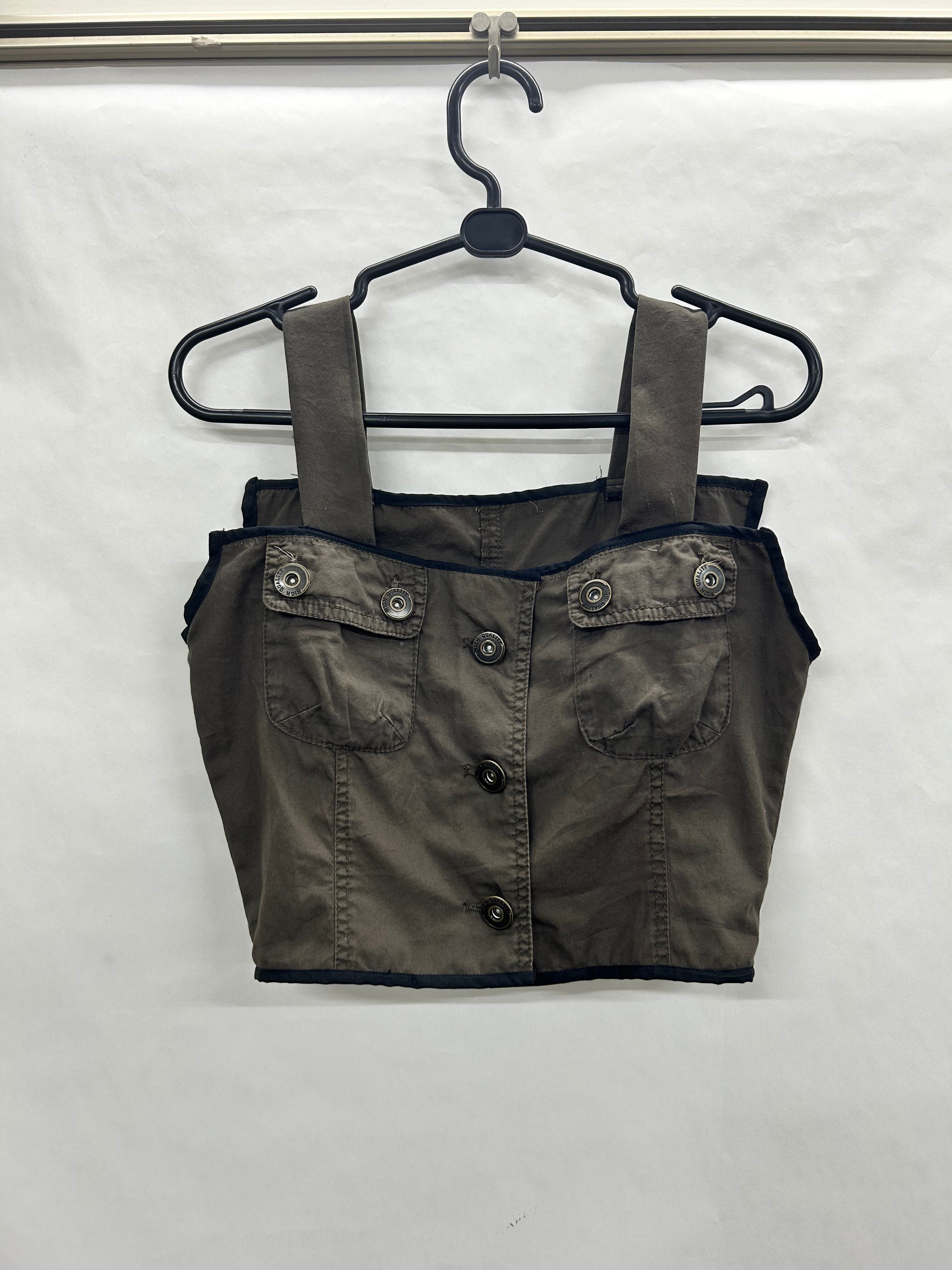 ボタンデザインが目を引く、ビスチェ型のトップスとフリルスカート。