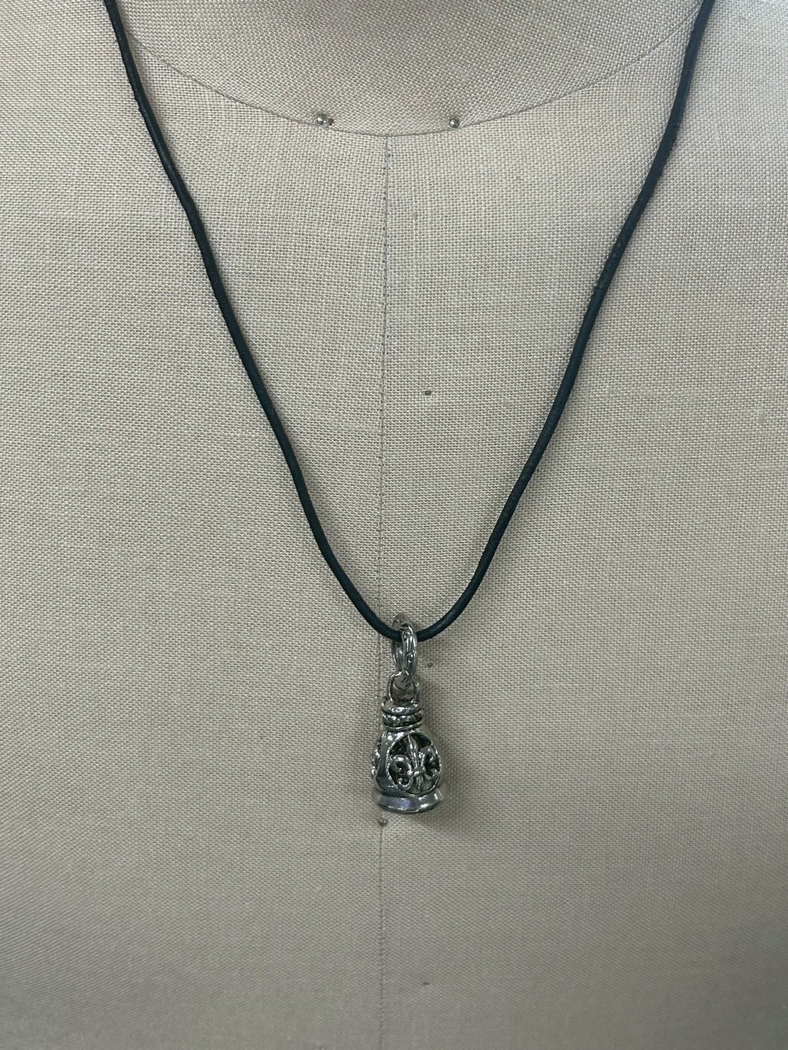 鐘の形をしたモチーフが、独自の魅力を引き立て、革紐との組み合わせがカジュアルなスタイルにもぴったり。